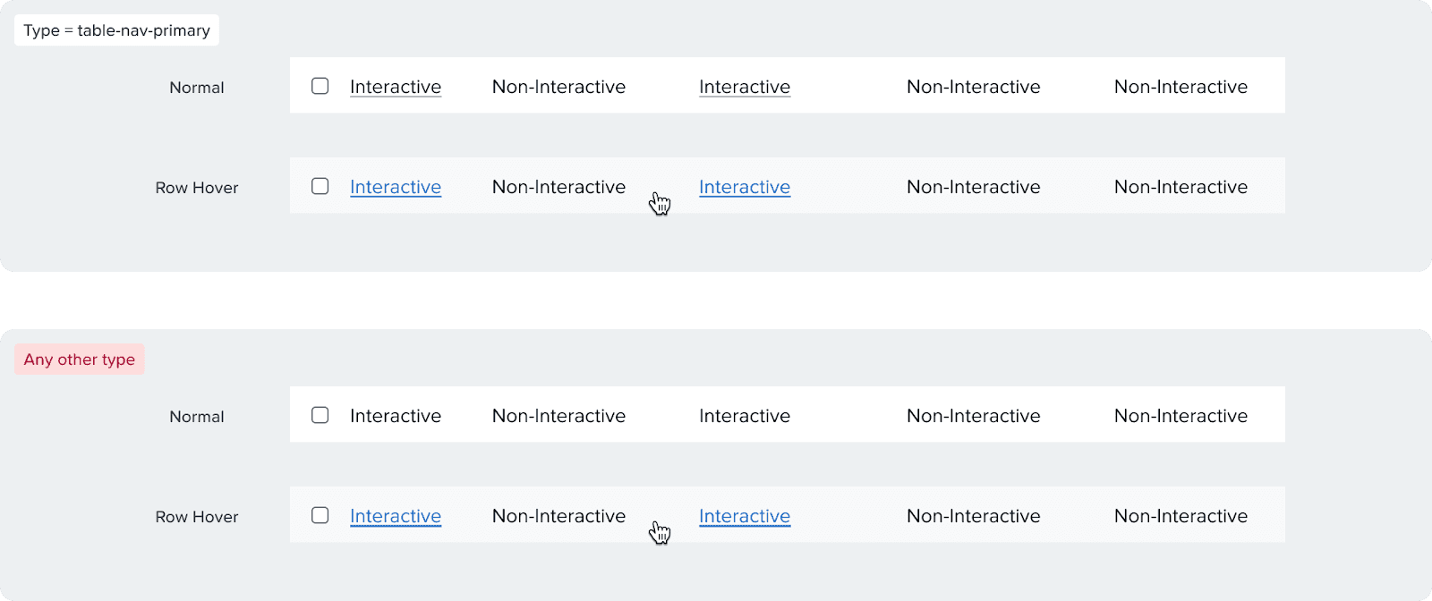 Table-nav-primary: Dark gray and underlined, used for tables and has a lower font weight (400 vs 500)